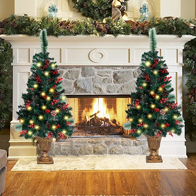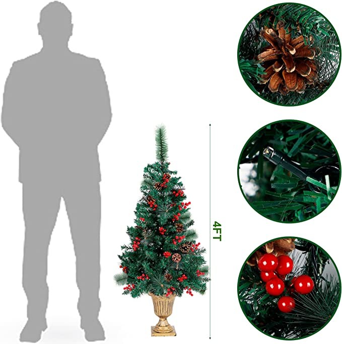Juegoal 4 FT Christmas Tree, Pre-Lit Crestwood Spruce Entrance Tree with 120 LEDs Fairy Lights, Pine Cones, Red Berries in Gold Urn Base for Front Door, Porch, Entryway Xmas Home Decorations, 2 Pack