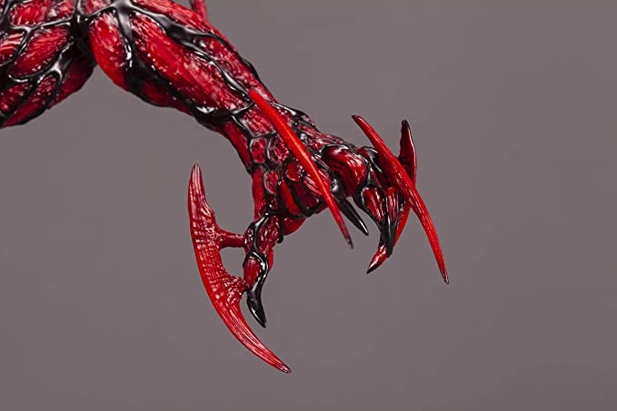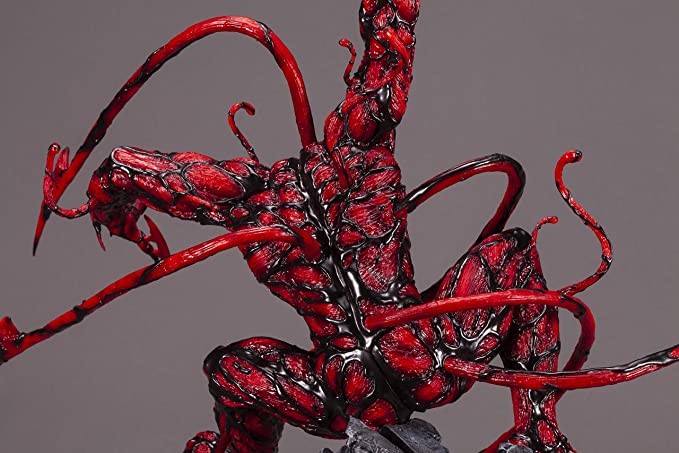 Kotobukiya Kotobukiya from Spider-Man's malicious and destructive carnage returns to the FINE ART STATUE series. The intense sculpting and detail on this creature's face has been replicated to the highest degree by cold casting, and has a level that far exceeds that of the last statue! The sharpened steel bows and arrows emerging from the body thoroughly reproduce Carnage's deadly symbiotic attack. These 5 traditional symbiotic figures can be interchanged to reproduce various shapes and poses. While the statue itself is already packed with punch, by using the included docking station, users can also attach an ARTFX Venom to this statue to recreate the battle between two symbiotes!