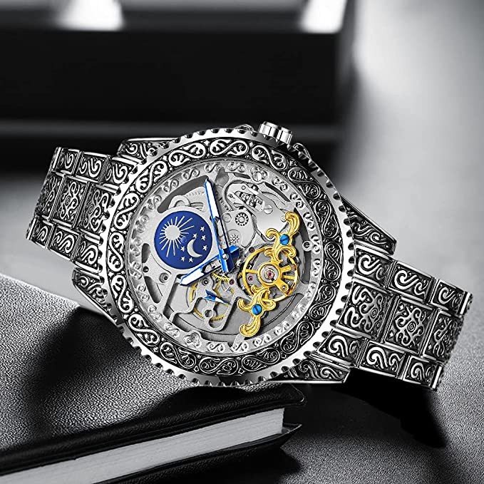 Mechanical Men's Watch Fashion Automatic Men's Clock Blue Stainless Steel Waterproof Business Skeleton Watch