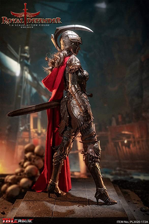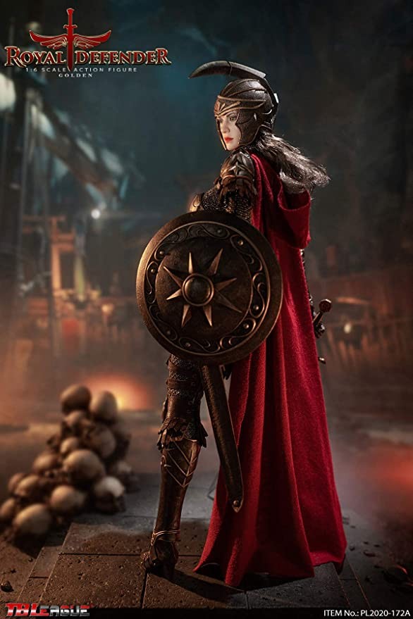 The Dark Knight reads from a letter sent from the front that the evil enemy is playing back. They face another fierce battle, but with an unbreakable faith in the protection of the realm and the people, the Royal Guard is ready! Packing List: 01) 1 x Head Sculpture02) 1 x TBLeague 1/6 Female None Sewn Body with Metal Frame03) 1 x Bodysuit04) 6 x Interchangeable Hand Gloves05) 1 x Neck Armor06) 1 x Leather Shoulder Armor07) 1 x Waist Armor08) 1 x forearm08 9) 1 x breast armor10) 1 x leather skirt11) 1 pair x heels12) 1 pair x knee pads13) 1 x helmet14) 1 x cape15) 1 x shield16) 1 x sword17) 1 x Sheath Packing: 1 Product/Separate Box GW: 1.37kg Dimensions: 24.3cm*9cm*38cm